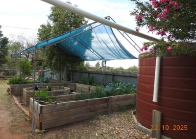 Water is supplied via 15 000 litre rainwater tanks plumbed to house and garden. Council water is also connected as needed.