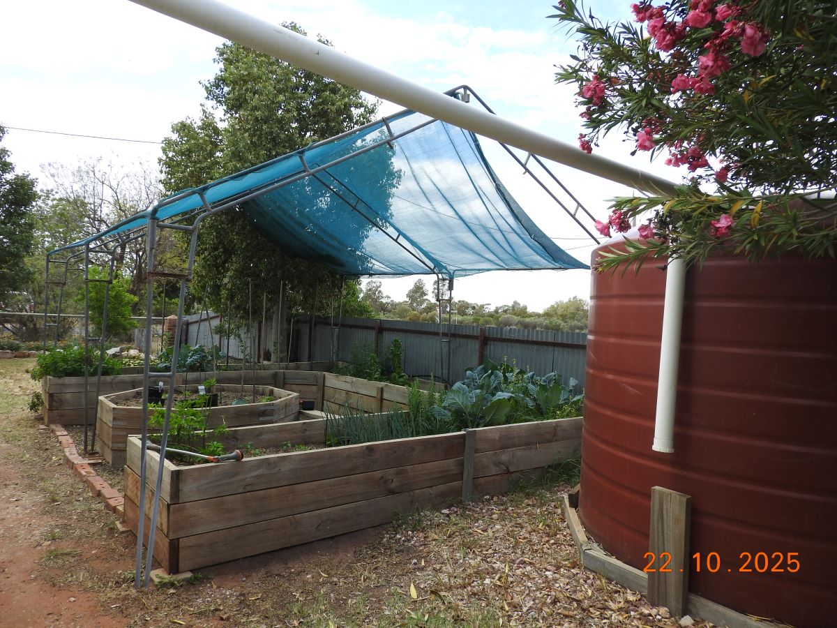 Water is supplied via 15 000 litre rainwater tanks plumbed to house and garden. Council water is also connected as needed.