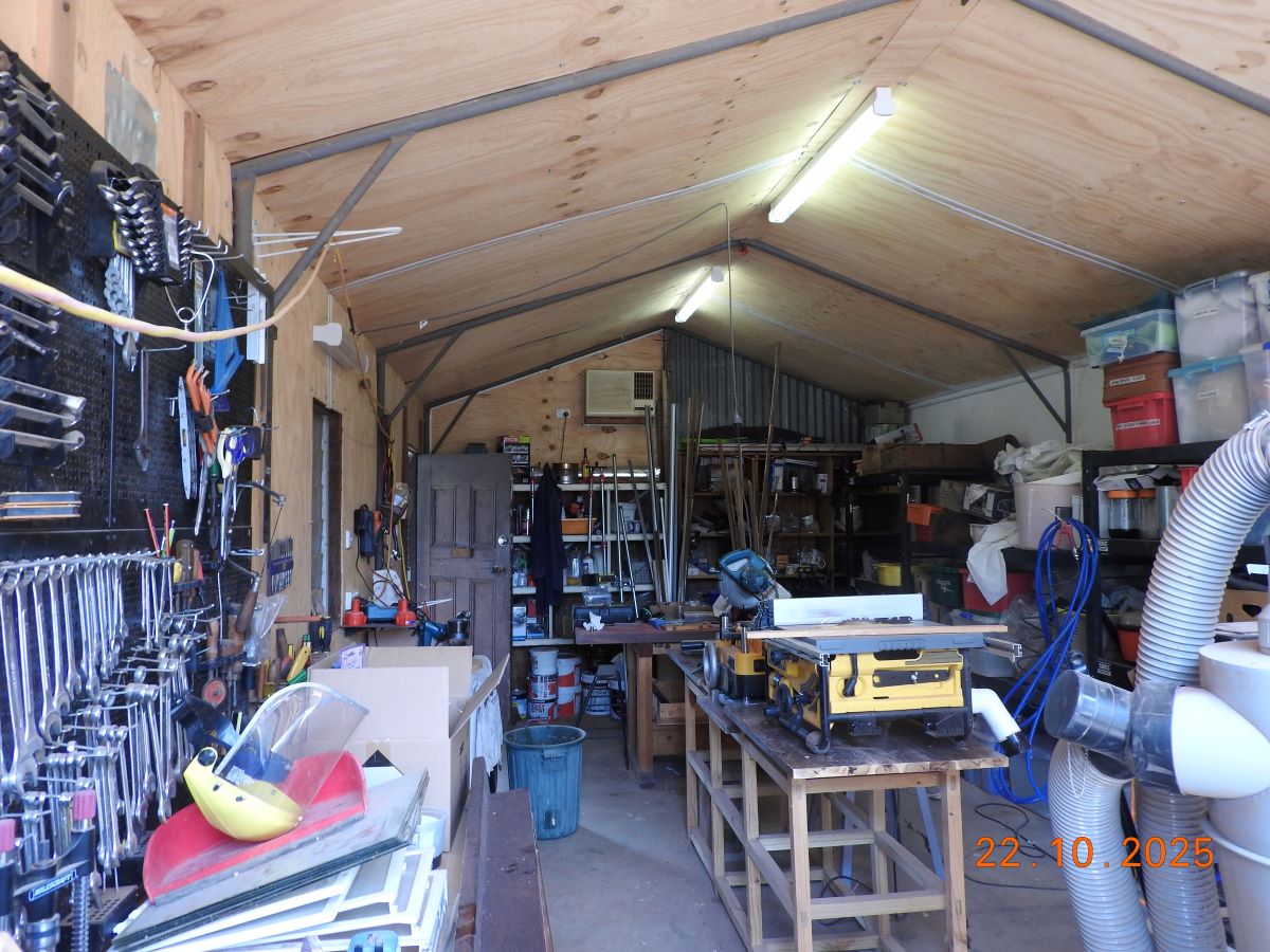Outbuildings include a 7.5 x 4m lined and insulated corrugated iron garage with air conditioning, concrete floor, shelves, benches and electricity.